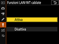 Selezionare Attiva per LAN/WT cablata > Funzioni LAN/WT cablate nel menu impostazioni della fotocamera.