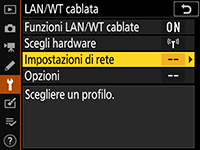 Selezionare LAN/WT cablata > Impostazioni di rete nel menu impostazioni della fotocamera.