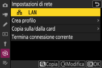 Selezionare un profilo e premere il multi-selettore a destra per tornare al menu LAN/WT cablata. Attendere che la fotocamera stabilisca la connessione.