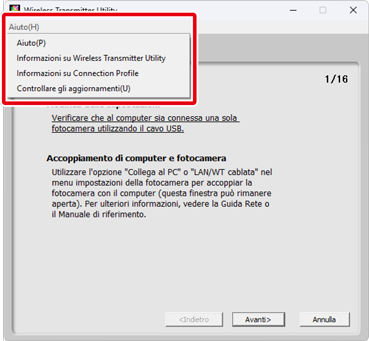 Visualizzare le informazioni sulla versione della Wireless Transmitter Utility e su Connection Profile.