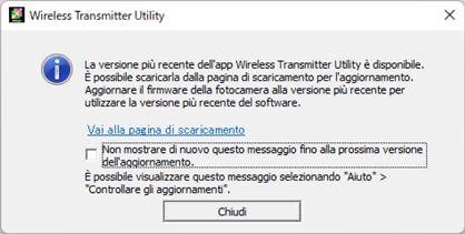 A seconda del modello di fotocamera, potrebbe essere necessario aggiornare non solo Connection Profile, ma anche la Wireless Transmitter Utility. In tal caso, all’avvio dell’applicazione verrà visualizzata una finestra di dialogo di notifica. È inoltre possibile visualizzare la finestra di dialogo di notifica dall’opzione Controllare gli aggiornamenti nel menu Aiuto.
