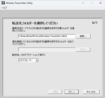 サブフォルダーを指定する場合は一度画面を閉じて、USB ケーブルでパソコンとカメラを接続してから、再びWireless Transmitter Utility を起動してください。ハードウェア選択画面で[内蔵無線LAN (Wi-Fi)]を選んで[次へ]をクリックし、アクション選択画面で[転送先フォルダーとアプリケーションを変更する]を選びます。[次へ]をクリックすると、転送先フォルダーの下の欄でサブフォルダーを指定できます。