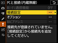 - D6:セットアップメニュー[PCと接続(内蔵無線)]→[接続設定]