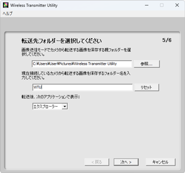 サブフォルダーを指定する場合は一度画面を閉じて、USB ケーブルでパソコンとカメラを接続してから、再びWireless Transmitter Utility を起動してください。ハードウェア選択画面で[有線LAN (内蔵接続端子/UT-1/WT-7)]を選んで[次へ]をクリックし、アクション選択画面で[転送先フォルダーとアプリケーションを変更する]を選びます。[次へ]をクリックすると、転送先フォルダーの下の欄でサブフォルダーを指定できます。