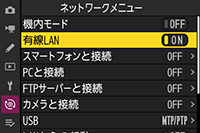 - Z6III:ネットワークメニュー[USB]を[USB-LAN]に設定します。