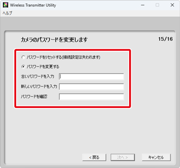 - 設定したパスワードを忘れてしまった場合は、[パスワードをリセットする]を選択して[次へ]ボタンをクリックし、パスワードをリセットして設定し直すことができます。ただし、パスワードをリセットすると、すでにカメラに設定した接続先の情報は削除されます。また、カメラで設定したFTPサーバーの接続先の情報も削除されます。