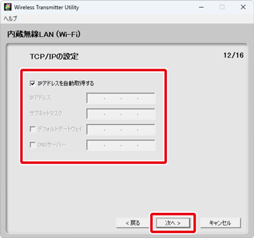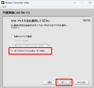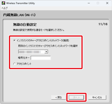 手順7で[自動セットアップ(推奨)]を選択すると、無線LANの設定を自動で行えます。[インフラストラクチャー(アクセスポイント)ネットワーク(推奨)]または[アクセスポイント]を選んで[次へ]をクリックすると、手順10まで進みます。