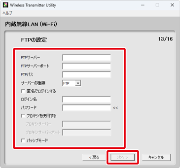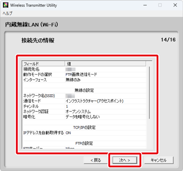 項目 設定内容 ネットワーク名(SSID) FTPサーバーが所属しているネットワークの識別名称を入力します。 通信モード [インフラストラクチャー(アクセスポイント)]モードまたは[アクセスポイント]モードのいずれかを選びます。 チャンネル アクセスポイントモードの場合のみ、通信で使用するチャンネルを選びます。ただしネットワーク名(SSID)が一致するとここで設定したチャンネルとは別のチャンネルが使用される場合があります。