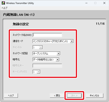 [通信モード]で[インフラストラクチャー(アクセスポイント)]を選んだ場合は、チャンネルは自動的に設定されます。