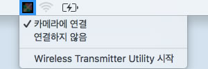 - Wireless Transmitter Utility가 설치되면 메뉴 바의 Wireless Transmitter Utility 아이콘을 사용하여 카메라 연결을 종료하거나 Wireless Transmitter Utility를 시작할 수 있습니다. 다음은 화상 전송이 작동 모드로 선택된 경우에만 사용할 수 있습니다.