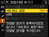 해당 카메라는 내장된 무선 LAN을 통해 컴퓨터와 페어링할 수 없습니다. 호환 가능한 네트워크 액세서리를 사용하십시오.