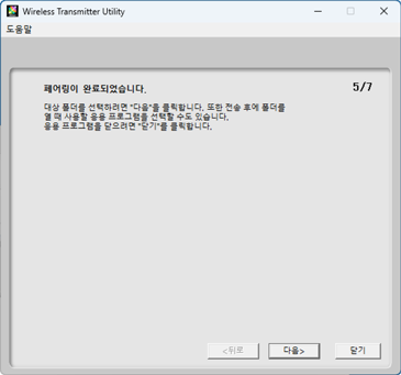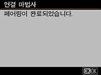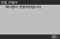 Wireless Transmitter Utility는 카메라와 컴퓨터를 자동으로 페어링합니다. 페어링이 완료되면 카메라와 Wireless Transmitter Utility에 해당 메시지가 표시됩니다. 카메라에서 OK 버튼을 누르고 Wireless Transmitter Utility에서 다음을 클릭하십시오.