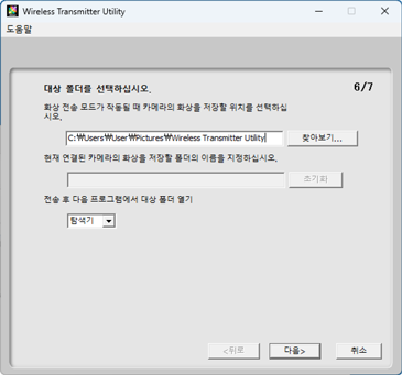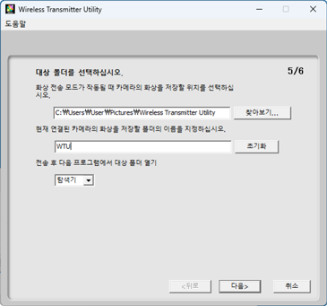 카메라에서 다운로드한 사진의 하위 폴더를 선택하려면 창을 닫고 USB를 통해 카메라와 컴퓨터를 연결한 다음 Wireless Transmitter Utility를 다시 실행하십시오. 하드웨어를 선택하라는 메시지가 표시되면 유선 LAN(내장 이더넷 포트/UT-1/WT-7)를 선택하고 다음을 클릭한 후 작업 대화 상자에서 대상 폴더 및 응용 프로그램 선택을 선택하십시오. 다음을 클릭하면 대상 폴더 아래에서 하위 폴더를 선택할 수 있는 대화 상자가 나타납니다.