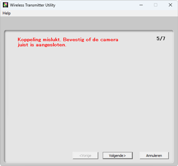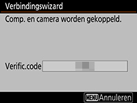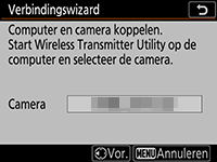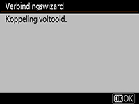 De Wireless Transmitter Utility koppelt de camera en computer automatisch. Wanneer het koppelen is voltooid, geven de camera en de Wireless Transmitter Utility dat via berichten aan; druk op de OK-knop op de camera en klik op Volgende in de Wireless Transmitter Utility.