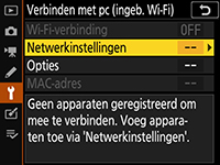 - Z9 / Z8 / Z6III / Z5II / Zf / Z50II / ZR: Netwerkmenu > Verbinden met computer > Netwerkinstellingen