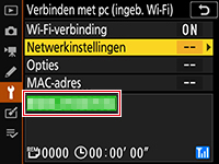 Zodra een verbinding tot stand is gebracht, geeft de camera de netwerkprofielnaam (standaard de netwerk-SSID) in groen weer.