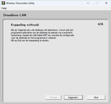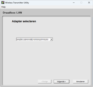 Volg de instructies op het scherm om een verbinding tot stand te brengen en de Wireless Transmitter Utility te starten. Kies desgevraagd een draadloos LAN-adapter in het vervolgkeuzemenu in de Wireless Transmitter Utility.