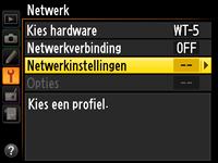 Selecteer Netwerk > Netwerkinstellingen in het camera-instellingenmenu en volg de instructies op het scherm om een netwerkprofiel te maken. Zie voor informatie over het maken van ethernetprofielen de Netwerkgids die bij de camera is geleverd. Zie voor informatie over gebruik van de WT-7 of WT-5 de documentatie die bij het apparaat is geleverd.