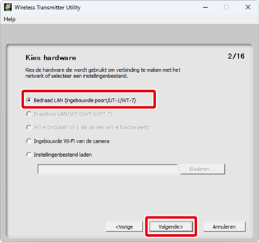 Selecteer Bedraad LAN (ingebouwde poort/UT-1/WT-7) en klik op Volgende.