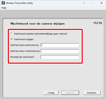 Door het selecteren van Wachtwoord voor de camera wijzigen voordat u klikt op Volgende in Stap 4 verschijnt er een wachtwoordinvoer-dialoogvenster. Als u een wachtwoord invoert in dit venster, vraagt de Wireless Transmitter Utility naar een wachtwoord wanneer de camera verbinding maakt met andere computers. Nadat het juiste wachtwoord is ingevoerd, wordt de prompt niet meer weergegeven.