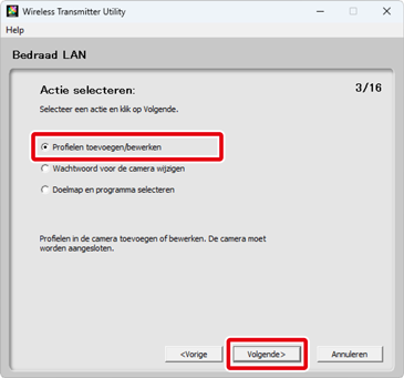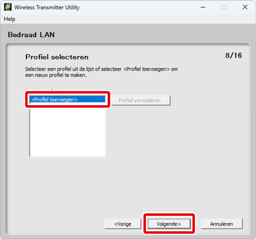 Om een bestaand netwerkprofiel te wijzigen, selecteert u het en klikt u op Volgende. Om een bestaand profiel te verwijderen, selecteert u het en klikt u op Profiel verwijderen. De Wireless Transmitter Utility kan niet worden gebruikt voor het aanpassen van profielen die zijn beveiligd met behulp van de cameraoptie Wachtwoordbeveiliging. Kies Uit voor Wachtwoordbeveiliging alvorens profielen te verwijderen of aan te passen.