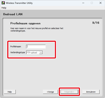Voer een profielnaam van maximaal 16 tekens in en kies een verbindingstype uit FTP-upload, Beeldoverdracht, Camerabediening of HTTP-server. Klik op Volgende wanneer de instellingen zijn voltooid.
