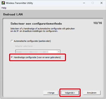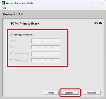 Als u Automatische configuratie (aanbevolen) kiest in Stap 7, worden TCP/IP-instellingen automatisch aangepast. Ga door naar Stap 9. Houd er rekening mee dat Automatische configuratie (aanbevolen) niet beschikbaar is als: