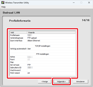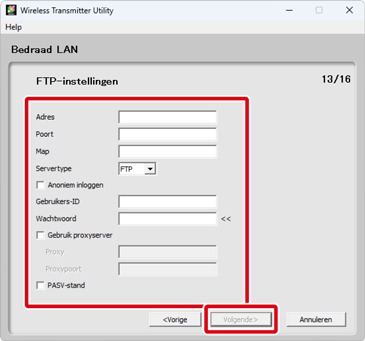 FTP-server-instellingen zijn alleen beschikbaar als FTP-upload is geselecteerd in Stap 6. Ga door naar Stap 10 als een andere optie is geselecteerd. Nadat u de instellingen hebt aangepast, klikt u op Volgende. Raadpleeg de onderstaande tabel voor meer informatie.