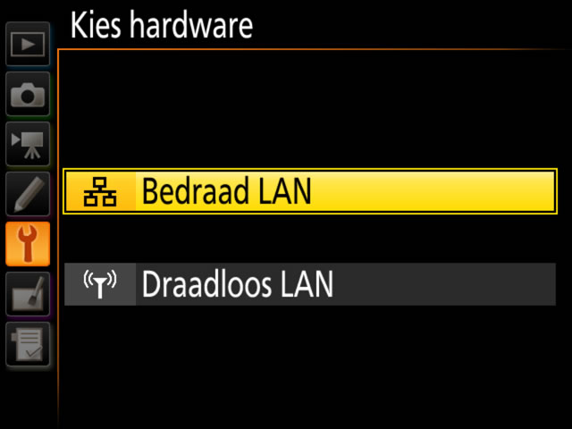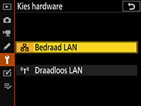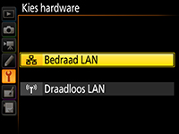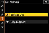 Selecteer Netwerk > Kies hardware > Bedraad LAN in het setup-menu van de camera.