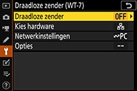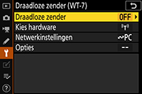 Selecteer Draadloze zender (WT-7) > Kies hardware > Draadloos LAN in het setup-menu van de camera.