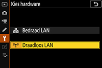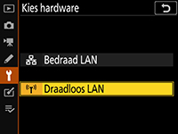 Selecteer Netwerk > Kies hardware > Draadloos LAN in het setup-menu van de camera.