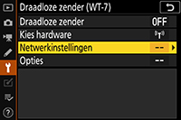 Selecteer Draadloze zender (WT-7) > Netwerkinstellingen in het setup-menu van de camera.