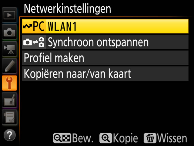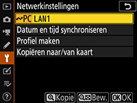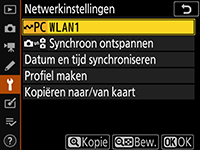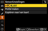Markeer een profiel en druk de multi-selector naar rechts om te selecteren en terug te keren naar het menu Netwerk. Als u Overdrachtstand in Stap 3 heeft geselecteerd, pas Overdrachtsinstellingen aan zoals beschreven in de handleiding in de WT-4.