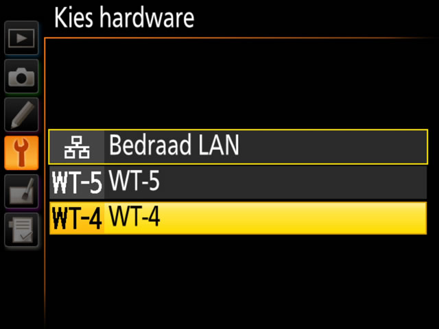 Selecteer Netwerk > Kies hardware > WT-4 in het setup-menu van de camera.