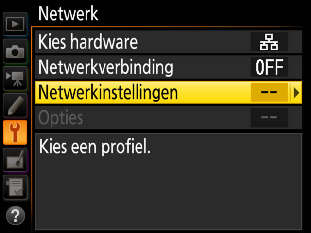 Markeer Netwerkinstellingen en druk de multi-selector naar rechts om een lijst met netwerkprofielen te zien.