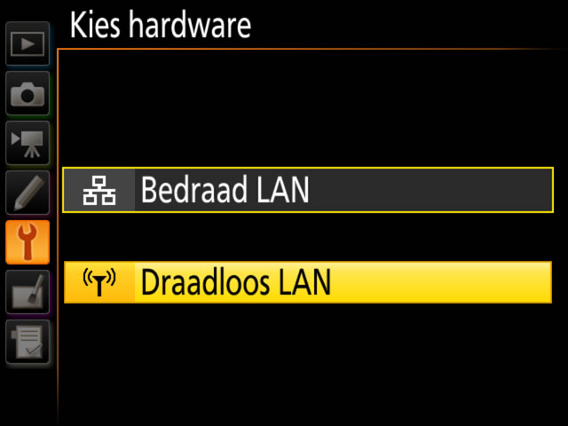 Selecteer Bedraad LAN/WT > Kies hardware > Draadloos LAN in het setup-menu van de camera.