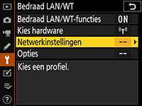 Markeer een profiel en druk de multi-selector naar rechts om terug te keren naar het menu Bedraad LAN/WT. Wacht tot de camera de verbinding tot stand heeft gebracht.