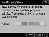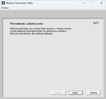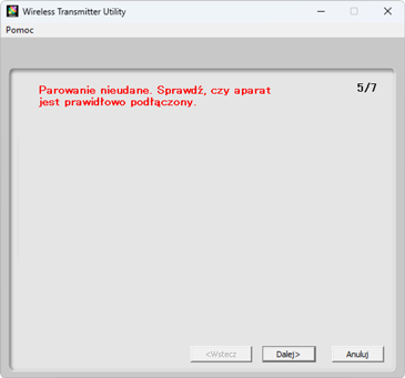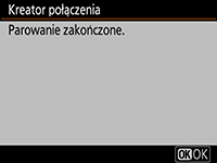 Program Wireless Transmitter Utility automatycznie sparuje aparat z komputerem. Po zakończeniu parowania w aparacie i w programie Wireless Transmitter Utility wyświetlone zostaną potwierdzające to komunikaty. Naciśnij przycisk OK na aparacie i kliknij Dalej w programie Wireless Transmitter Utility.