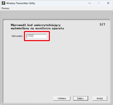 Wprowadź kod uwierzytelniający w programie Wireless Transmitter Utility i kliknij Dalej.