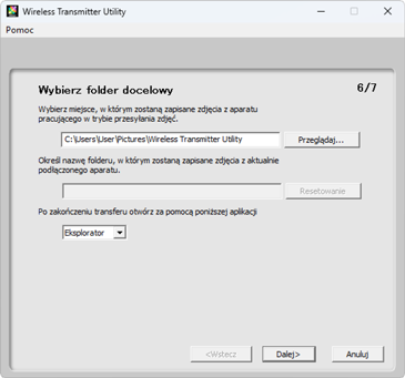 Aby wybrać podfolder dla zdjęć pobranych z aparatu, zamknij okno, podłącz aparat do komputera przez USB, a następnie uruchom ponownie program Wireless Transmitter Utility. Gdy pojawi się monit wymagający wybrania sprzętu, wybierz Wbudowana sieć Wi-Fi aparatu, kliknij Dalej, po czym wybierz Wybierz folder docelowy i aplikację w oknie dialogowym akcji. Kliknięcie Dalej spowoduje następnie przejście do okna dialogowego, w którym można wybrać podfolder w folderze docelowym.