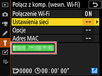 Po nawiązaniu połączenia, nazwa profilu sieciowego (domyślnie jest to identyfikator SSID sieci) zostanie wyświetlona w aparacie na zielono.