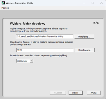 Aby wybrać podfolder dla zdjęć pobranych z aparatu, zamknij okno, podłącz aparat do komputera przez USB, a następnie uruchom ponownie program Wireless Transmitter Utility. Gdy pojawi się monit wymagający wybrania sprzętu, wybierz Przewodowa sieć LAN (port wbudowany/UT-1/WT-7), kliknij Dalej, po czym wybierz Wybierz folder docelowy i aplikację w oknie dialogowym akcji. Kliknięcie Dalej spowoduje następnie przejście do okna dialogowego, w którym można wybrać podfolder w folderze docelowym.