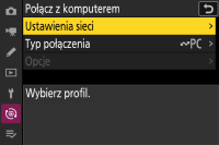 Wybierz Przewodowa sieć LAN/WT > Ustawienia sieci w menu ustawień aparatu i postępuj zgodnie z poleceniami wyświetlanymi na ekranie, aby utworzyć profil sieciowy. Aby uzyskać informacje na temat tworzenia profili Ethernet, skorzystaj z Dokumentacji aparatu używanego aparatu. Aby uzyskać informacje na temat korzystania z przekaźnika WT-6, skorzystaj z Dokumentacji aparatu używanego aparatu lub instrukcji przekaźnika WT-6.