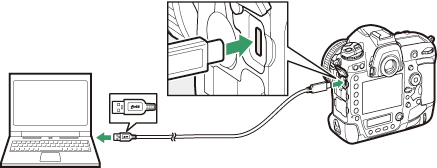 Po włączeniu komputera i poczekaniu, aż komputer się uruchomi, podłącz aparat do komputera za pomocą dołączonego do zestawu kabla USB, a następnie włącz aparat. Zakończ program Nikon Transfer 2, jeśli się uruchomi.