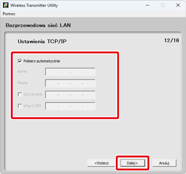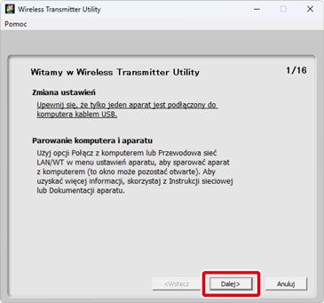 Kliknij Dalej, gdy program Wireless Transmitter Utility się uruchomi.