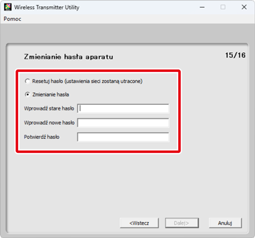 Wybranie Zmienianie hasła aparatu przed kliknięciem Dalej w kroku 4 powoduje wyświetlenie okna dialogowego wprowadzania hasła. Wpisanie hasła w tym oknie dialogowym sprawi, że program Wireless Transmitter Utility będzie wyświetlać monit wymagający wprowadzenia hasła po podłączeniu aparatu do innych komputerów. Po wprowadzeniu prawidłowego hasła monit nie będzie wyświetlany ponownie.