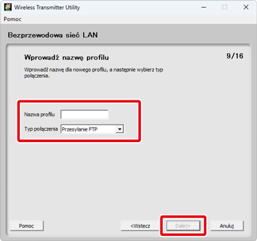 Wprowadź nazwę profilu o długości do 16 znaków i wybierz typ połączenia spośród Przesyłanie FTP, Przesyłanie zdjęć, Sterowanie aparatem i Serwer HTTP. Kliknij Dalej po zakończeniu regulacji ustawień.