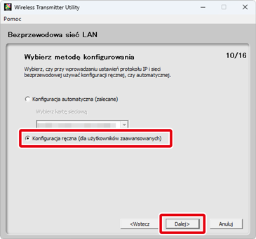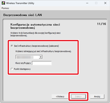 Jeśli wybrano Konfiguracja automatyczna (zalecane) w kroku 7, ustawienia bezprzewodowej sieci LAN zostaną dostosowane automatycznie. Wybierz Sieć infrastruktury bezprzewodowej (zalecane) lub Punkt dostępowy, po czym kliknij Dalej, aby przejść do kroku 10.