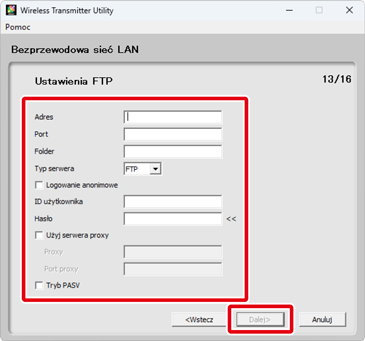 Ustawienia serwera FTP będą dostępne tylko wtedy, gdy Przesyłanie FTP zostanie wybrane w kroku 6. Przejdź do kroku 11, jeśli wybrano inną opcję. Po dostosowaniu ustawień kliknij przycisk Dalej. Aby uzyskać więcej informacji, skorzystaj z poniższej tabeli.
