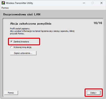 Na tym kończy się konfiguracja sieci bezprzewodowej. Aby uzyskać informacje na temat łączenia się z siecią z aparatu, patrz „Nawiązywanie połączenia z użyciem profili utworzonych na komputerze”.